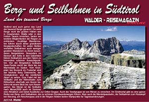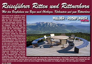 Südtirol wird auch gerne das Land der tausend Berge genannt. Da viele Berge nicht die großen Höhen wie in Graubünden, im Wallis oder in den Hohen Tauern erreichen, bieten sie breitere Möglichkeiten die Region zu entdecken. Unzählige Wanderrouten führen durch diese grandiosen Berglandschaften. An vielen Stellen verhelfen Seilbahnen auch weniger geübten Wanderern zu ihrem besonderen Bergerlebnis. Besonders im Bereich Bozen führen Seilbahnen aus den Tälern zu besonders schönen Aussichtpunkten. Eine Fahrt mit der Seilbahn und der Rittnerbahn zum Rittnerhorn oberhalb von Bozen belohnt mit einem Blick bis zum Rosengarten. Die Verkehrsverbindung zwischen Bozen und dem Ritten hat eine lange Tradition. Denn vor über 100 Jahren fuhren die Bozner Patrizier bereits mit der Zahnradbahn vom Waltherplatz auf den Ritten. Diese wurde 1966 durch eine Seilschwebebahn ..._/W1