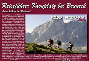 Der Kronplatz ist ein 2275 Meter hoher Berg am Rande der Dolomiten. Er gilt als Hausberg von Bruneck und ist ein bekanntes Ausflugsziel. Die Ferienregion Kronplatz ist ein Urlaubsparadies für Wanderer, Genießer und Familien. Der magische Reiz der Dolomiten, das saftige Grün der Wiesen und Almen, stille Wälder, verträumte Bergseen und drei Naturparks laden ein zum Wandern, Bergsteigen, Erholen und Erleben - und dies unter der herrlichen Kulisse der Dolomiten, die als UNESCO Weltnaturerbe ausgezeichnet wurden. Die Friedensglocke Concordia 2000 in einem schlanken Glockenturm mit feiner Spitze ist wegen ihrer exponierten Lage eine besondere Sehenswürdigkeit. Über ein Natursteinfundament erreicht man die Aussichtsplattform mit dem Panoramarelief, das die umliegenden Berge darstellt. Ein idealer Platz, um die herrliche Gebirgslandschaft zwischen Zillertaler Alpen und Dolomiten. ...