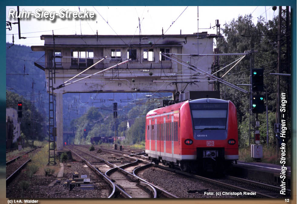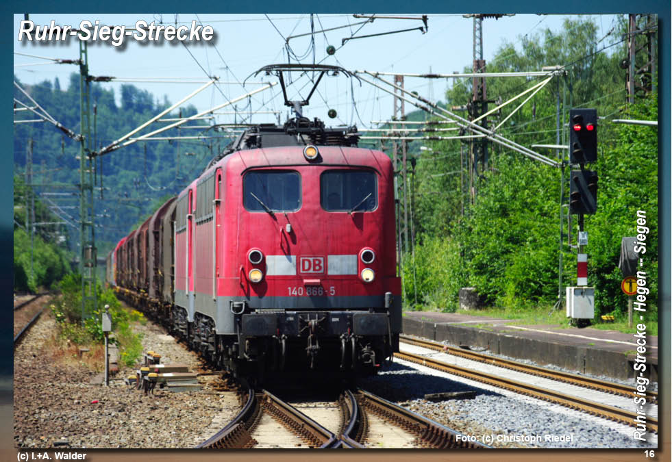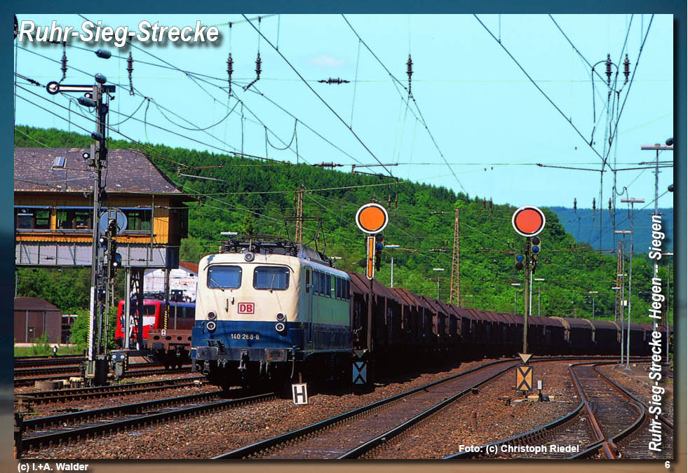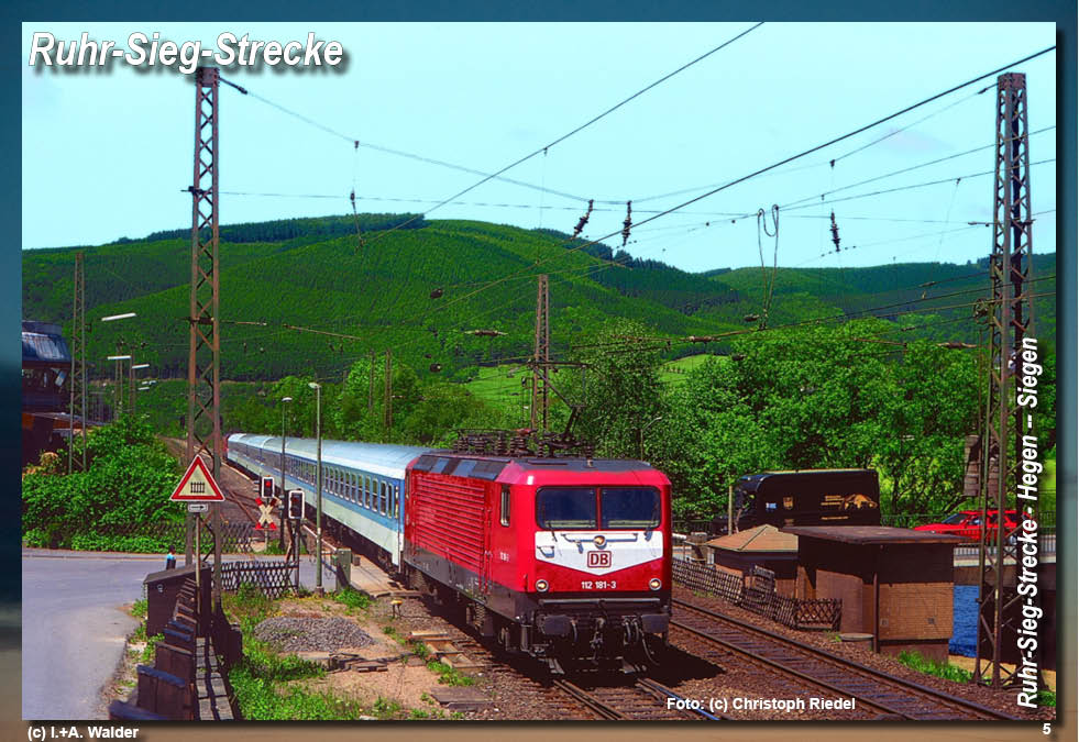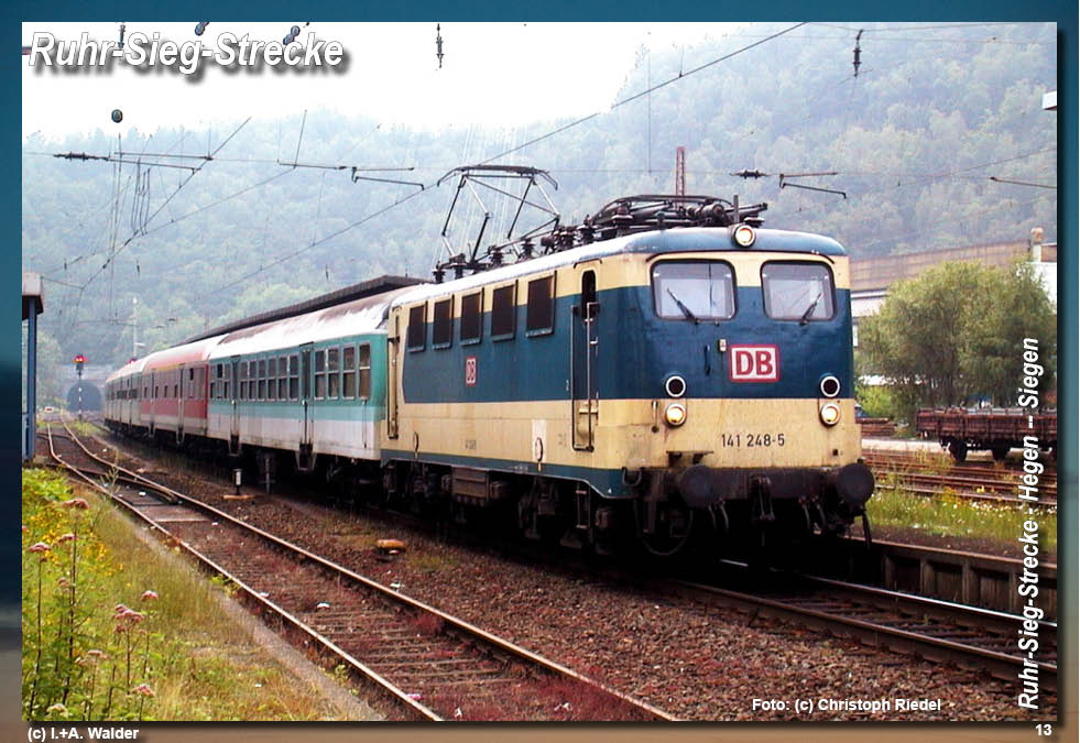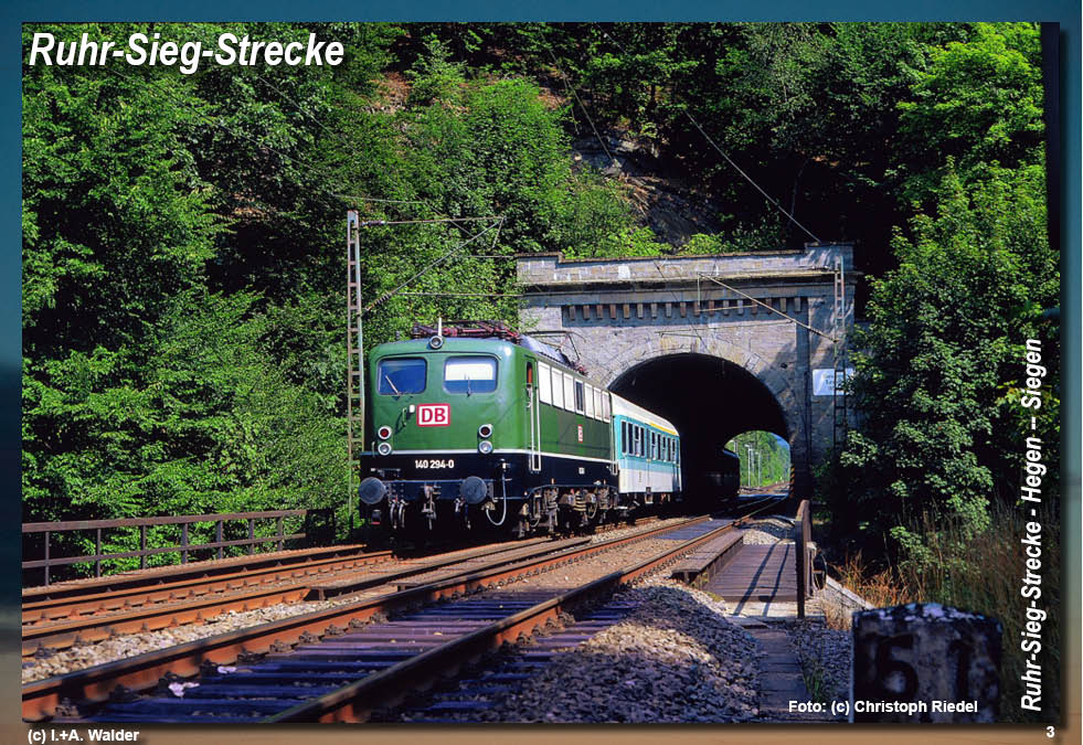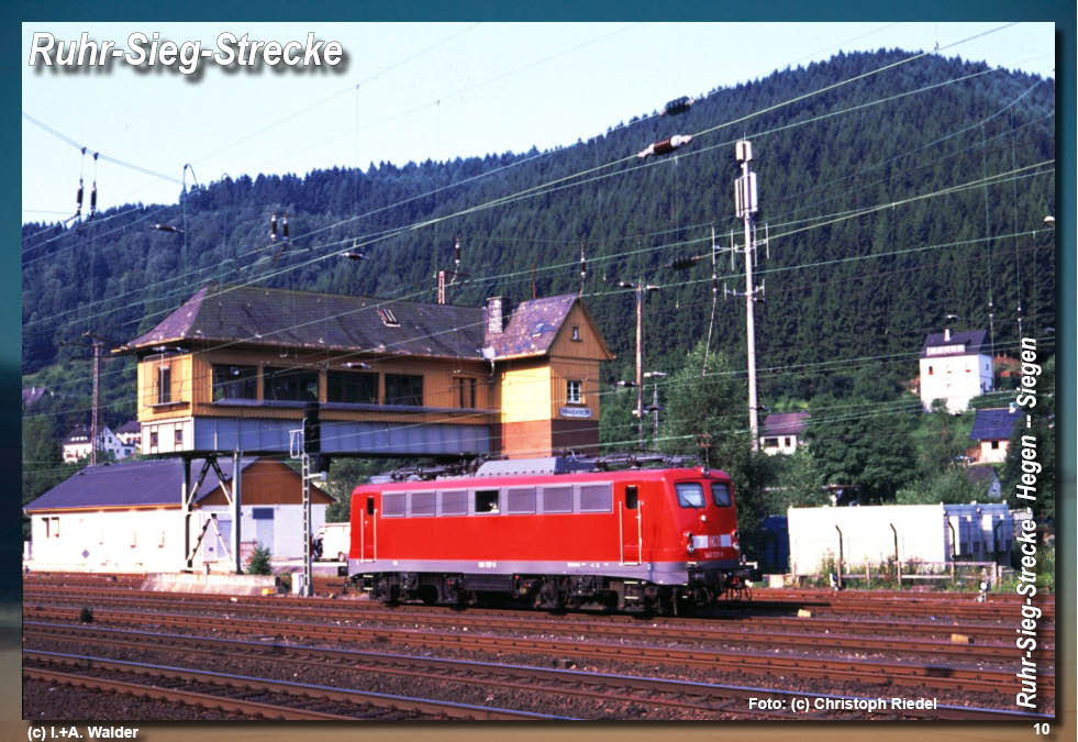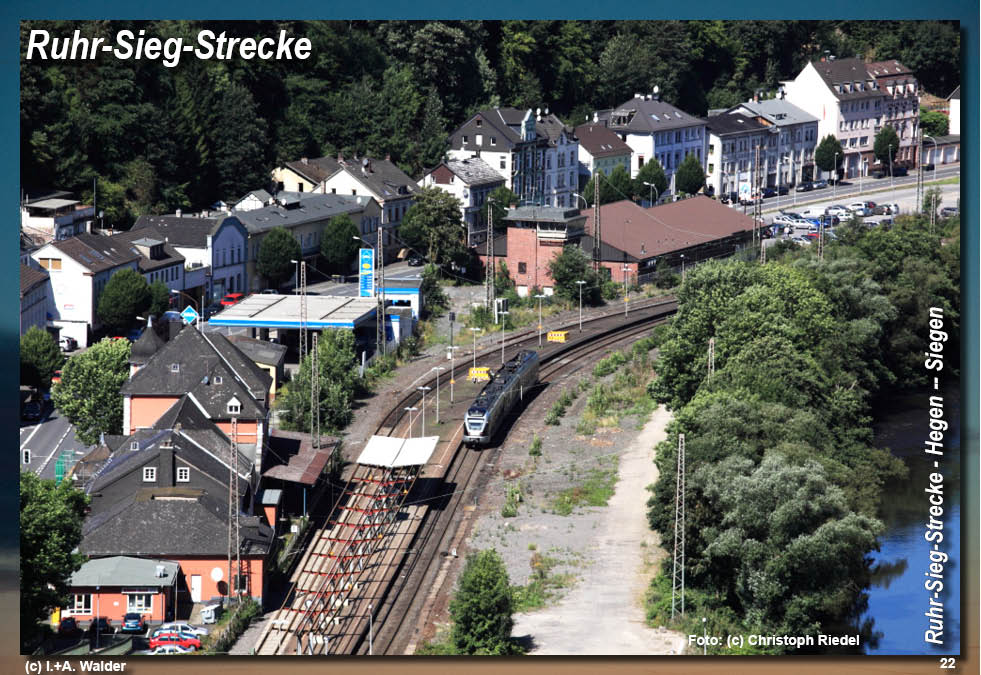 Die Ruhr-Sieg- Strecke verbindet als seit 1965 elektrifizierte Hauptbahn den Hauptbahnhof Hagen am Rande des Sauerlandes mit dem Hauptbahnhof der Stadt Siegen und folgt dabei zunächst auf einer längeren Strecke dem Fluss Lenne. Kurz hinter Altenhundem muss über eine Rampe die Wasserscheide zur Sieg überwunden werden. Die Strecke führt dann durch die Täler von Littfe und Ferndorfbach bis Siegen, wo das Siegtal erreicht wird. In Altenhundem befand sich zur Dampflokzeit ein sehr großes Bahnbetriebswerk, das Güterzüge 'aus der Mitte' bespannte und für die notwenigen Schiebedienste auf der Rampe verantwortlich war. Auch heute noch müssen dort Loks zum Nachschieben der schweren Güterzüge vorgehalten werden. Von den einst zahlreichen abzweigenden Nebenstrecken sind nur die Biggetalbahn, die heute als Stichstrecke von Finnentrop längs der Biggetalsperre nach Olpe führt, die Strecke (Siegen-) Kreuztal - Bad Berleburg und die elektrifizierte Strecke nach Iserlohn, die in Letmathe abzweigt, übrig geblieben.