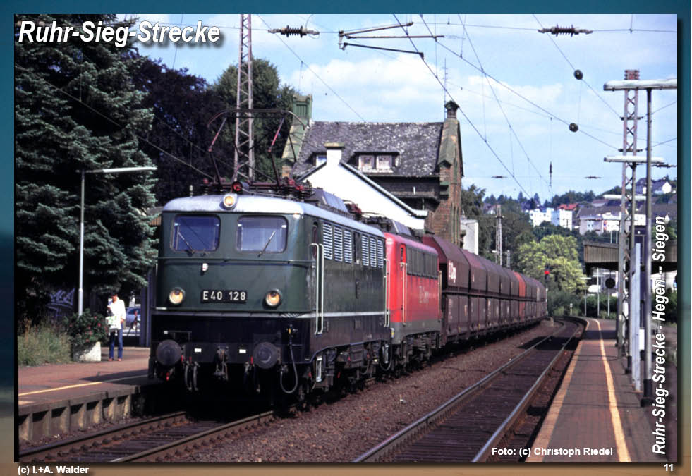 Aus den Anfangszeiten der Elektrifizierung könnte das Foto stammen, würde E 40 128 in Plettenberg nicht von einer roten Schwestermaschine begleitet, die zeigt, dass das Foto aus jüngerer Zeit stammt.