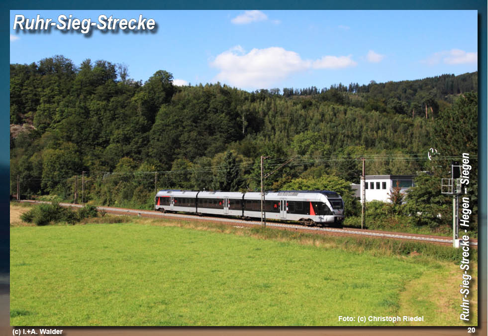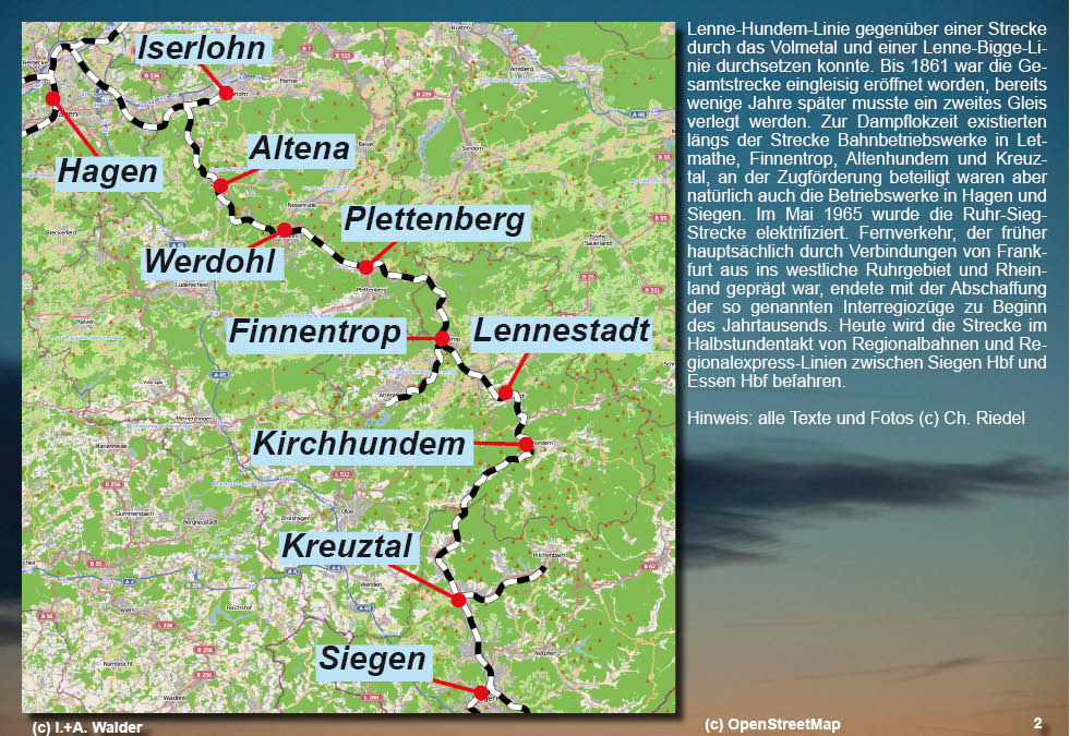 Um das Siegerländer Erzrevier mit der Ruhrkohle zu verbinden, wurde Mitte des 19.Jahrhunderts eine Bahnverbindung zwischen Hagen und Siegen geplant. Drei Streckenvarianten standen zur Diskussion, wobei sich letztlich die Lenne-Hundem-Linie gegenüber einer Strecke durch das Volmetal und einer Lenne-Bigge-Linie durchsetzen konnte. Bis 1861 war die Gesamtstrecke eingleisig eröffnet worden, bereits wenige Jahre später musste ein zweites Gleis verlegt werden. Zur Dampflokzeit existierten längs der Strecke Bahnbetriebswerke in Letmathe, Finnentrop, Altenhundem und Kreuztal, an der Zugförderung beteiligt waren aber natürlich auch die Betriebswerke in Hagen und Siegen. Im Mai 1965 wurde die Ruhr-Sieg- Strecke elektrifiziert. Fernverkehr, der früher hauptsächlich durch Verbindungen von Frankfurt aus ins westliche Ruhrgebiet und Rheinland geprägt war, endete mit der Abschaffung der so genannten Interregiozüge zu Beginn des Jahrtausends. Heute wird die Strecke im Halbstundentakt von Regionalbahnen und Regionalexpress-Linien zwischen Siegen Hbf und Essen Hbf befahren.