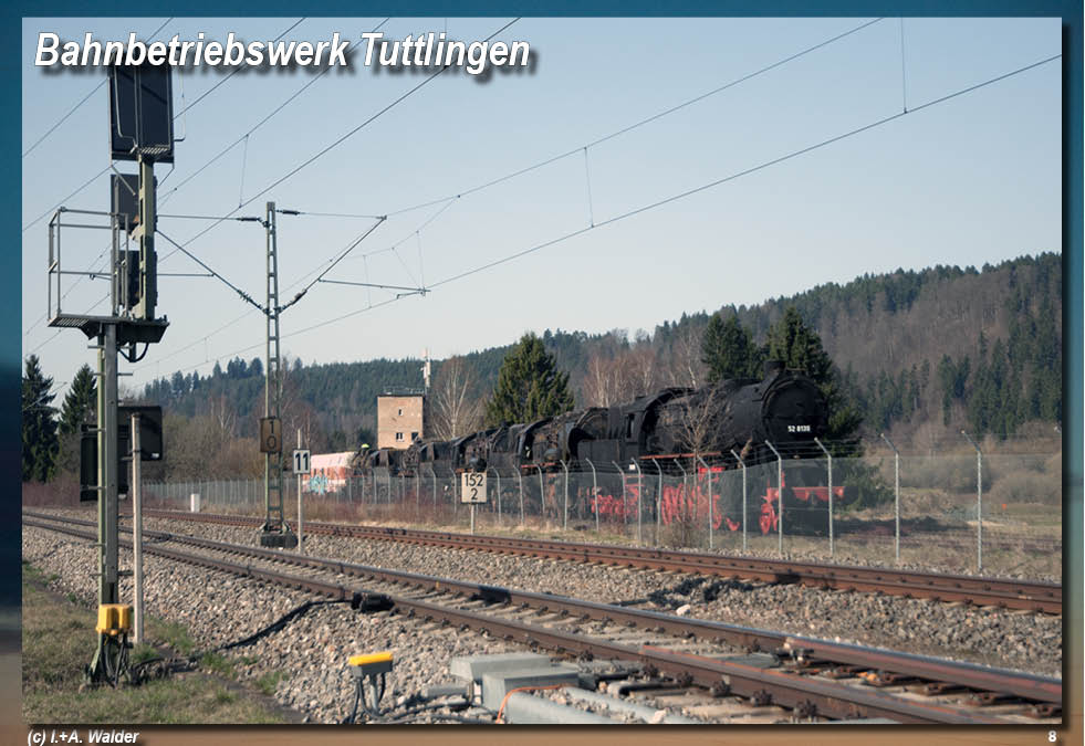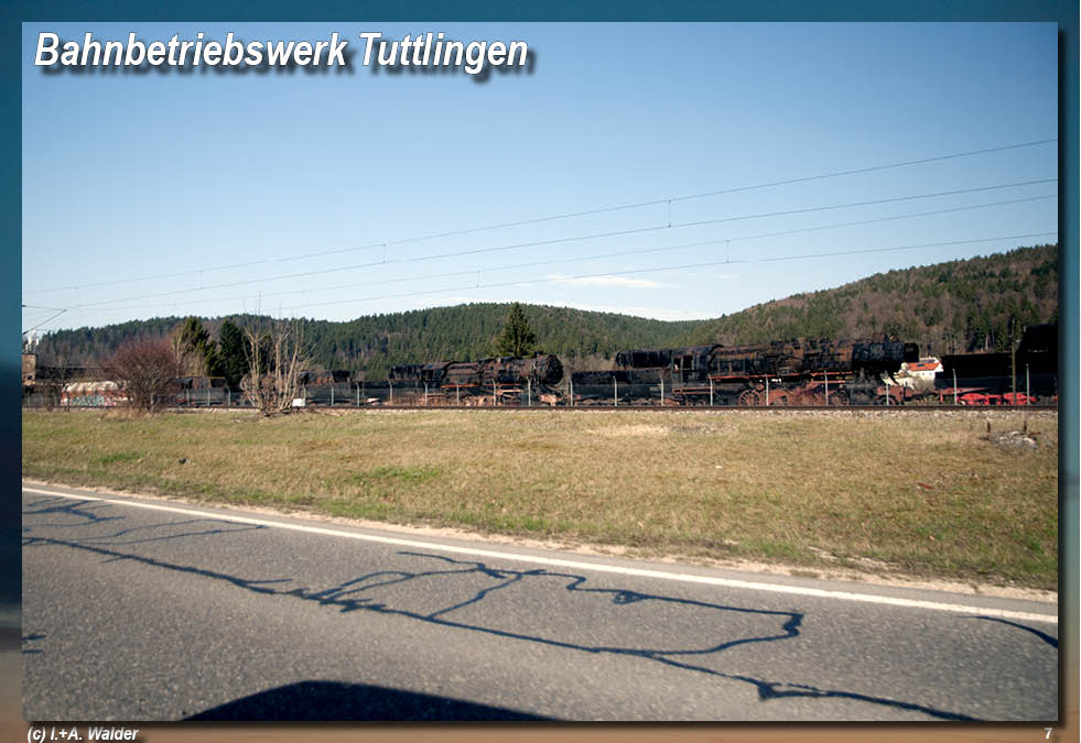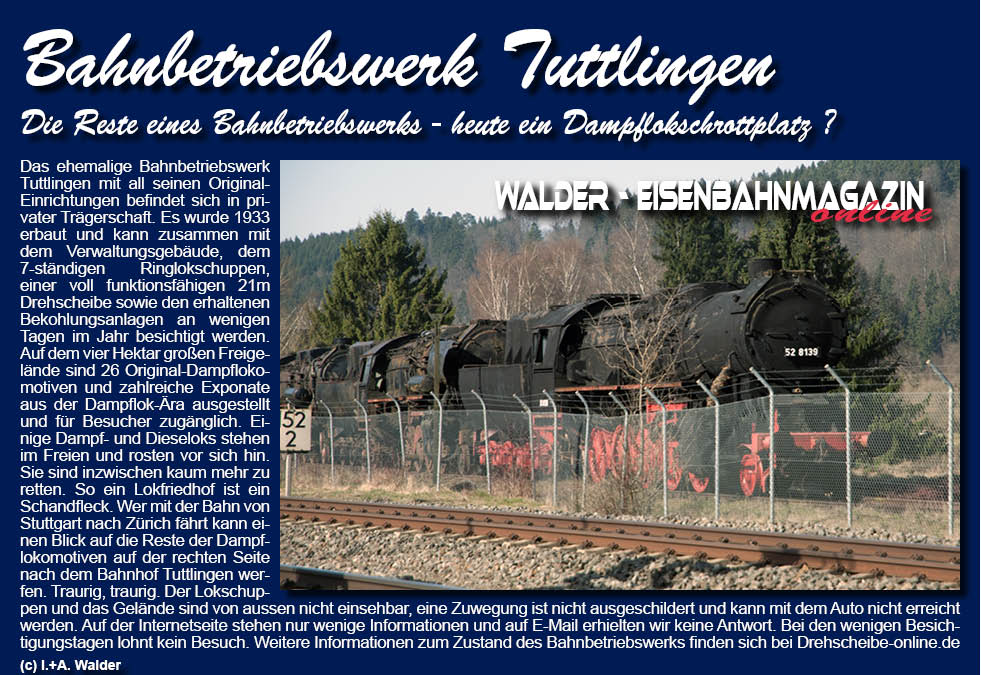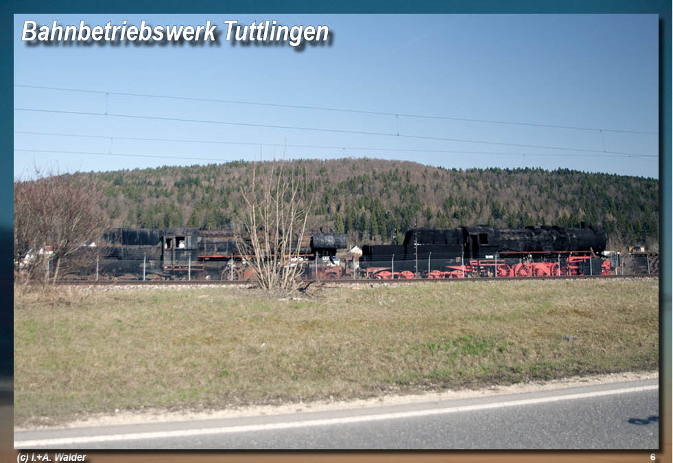 Das ehemalige Bahnbetriebswerk Tuttlingen mit all seinen Original-Einrichtungen befindet sich in privater Trägerschaft. Es wurde 1933 erbaut und kann zusammen mit dem Verwaltungsgebäude, dem 7-ständigen Ringlokschuppen, einer voll funktionsfähigen 21m Drehscheibe sowie den erhaltenen Bekohlungsanlagen an wenigen Tagen im Jahr besichtigt werden. Auf dem vier Hektar großen Freigelände sind 26 Original-Dampflokomotiven und zahlreiche Exponate aus der Dampflok-Ära ausgestellt und für Besucher zugänglich. Einige Dampf- und Dieseloks stehen im Freien und rosten vor sich hin. Sie sind inzwischen kaum mehr zu retten. So ein Lokfriedhof ist ein Schandfleck. Wer mit der Bahn von Stuttgart nach Zürich fährt kann einen Blick auf die Reste der Dampflokomotiven auf der rechten Seite nach dem Bahnhof Tuttlingen werfen. Traurig, traurig. Der Lokschuppen und das Gelände sind von aussen nicht einsehbar, eine Zuwegung ist nicht ausgeschildert und kann mit dem Auto nicht erreicht werden. Auf der Internetseite stehen nur wenige Informationen und auf E-Mail erhielten wir keine Antwort. Bei den wenigen Besichtigungstagen lohnt kein Besuch. Weitere Informationen zum Zustand des Bahnbetriebswerks finden sich bei Drehscheibe online.