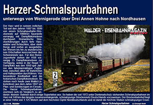 Harzquerbahn - Der Harz wird in seinem östlichen Teil seit den Jahren 1887 bis 1899 von einem Schmalspurbahn- Streckennetz auf 1000mm Spurweite vorrangig mit Dampflokomotiven durchquert. Romantische Streckenführungen durch tiefe Harzwälder und Schluchten, über steile Berge und vorbei an ausgedehnten Wiesen bis hin zu wunderschönen Ortschaften kennzeichnen das Schienennetz aus. Für den Reisezugverkehr stehen der HSB vorrangig 25 Dampflokomotiven zur Verfügung, wobei in der Regel 17 Dampfloks aus den 1950er Jahren den fahrplanmäßigen Zugbetrieb zwischen allen 48 Bahnhöfen und Haltepunkten durchführen. Von besonderer Kostbarkeit sind die historischen Dampflokomotiven. So stehen noch heute zwei Mallet-Lokomotiven aus dem Jahre 1897 vor Plan- und Sonderzügen im Einsatz. Die Harzer Schmalspurbahnen ...