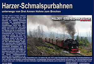 Brockenbahn - Der Harz wird in seinem östlichen Teil seit den Jahren 1887 bis 1899 von einem Schmalspurbahn- Streckennetz auf 1000mm Spurweite vorrangig mit Dampflokomotiven durchquert. Romantische Streckenführungen durch tiefe Harzwälder und Schluchten, über steile Berge und vorbei an ausgedehnten Wiesen bis hin zu wunderschönen Ortschaften kennzeichnen das Schienennetz aus. Für den Reisezugverkehr stehen der HSB vorrangig 25 Dampflokomotiven zur Verfügung, wobei in der Regel 17 Dampfloks aus den 1950er Jahren den fahrplanmäßigen Zugbetrieb zwischen allen 48 Bahnhöfen und Haltepunkten durchführen. Von besonderer Kostbarkeit sind die historischen Dampflokomotiven. So stehen noch heute zwei Mallet-Lokomotiven aus dem Jahre 1897 vor Plan- und Sonderzügen im Einsatz. Die Harzer Schmalspurbahnen ...